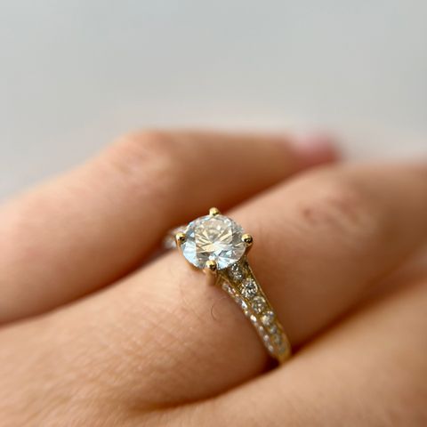 Denne ringen har en 100% naturlig rund briljantslipt diamant med total caratvekt på hele 1.52ct i farge G (Nær fargeløs) og klarhet SI1. Dette gir et kraftig, luksuriøst lysspill som virkelig skiller seg ut og setter standarden.