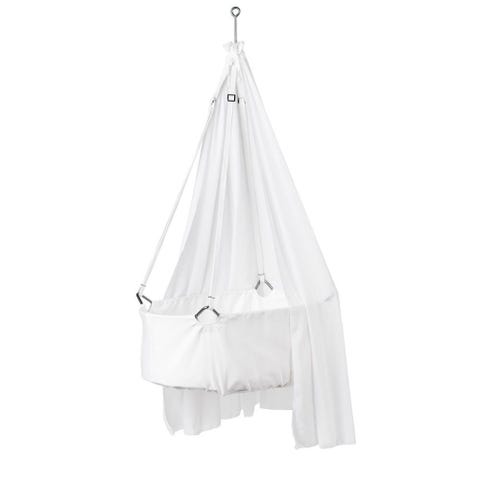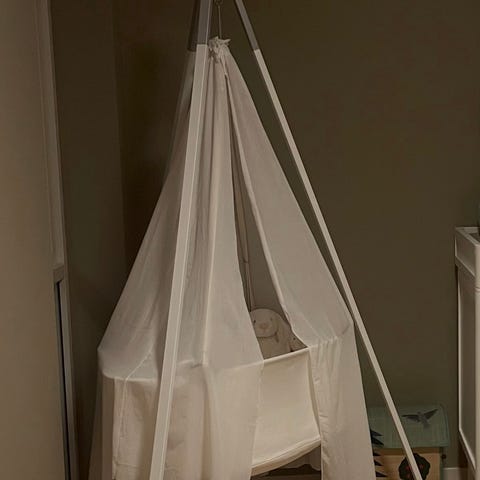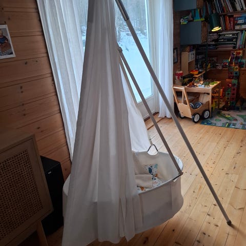 Vugge til barn selges ettersom den ikke blir brukt lenger. Denne er så si ny, og det finnes ikke noe merker på den da den har blitt brukt kun i 1 måned maks. Kan henges opp i taket eller på stativ. Passer for nyfødte og til 6 måneder/10kg. Denne ble kjøpt for 3400kr fra nettsiden jollyroom.