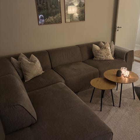 Vi elsker sofaen og den rommer mange personer! 2 stk kan fint ligge og se tv på sjeselongen.