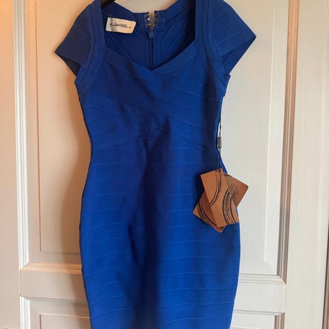 kjole i blå cordfløyel, størrelse L. Kjolen har et enkelt design med teksturdetaljer og er beregnet for kvinner.