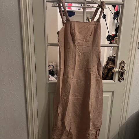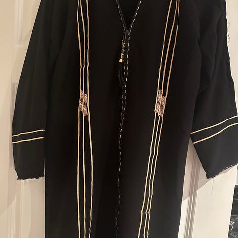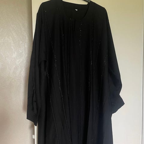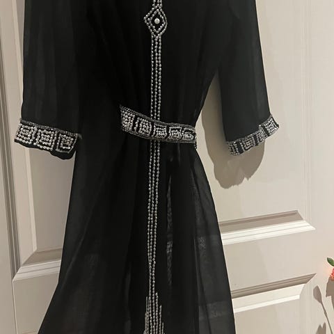 kjole i svart farge. Kjolen er designet for kvinner og har størrelse 40. Den har dekorative detaljer med perler langs midje og ermer, samt plisserte partier nederst.