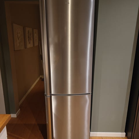 Smeg kombiskap med kjøleskap og fryser. Kjøleskapet har flere hyller og dørhyller for oppbevaring av mat og drikke. Fryseren har eget rom med hylle. Enheten har en retro design med kromdetaljer på håndtakene. Godt brukt men funker helt utmerket!