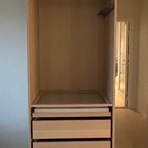 Består av 2 oppheng, en skuff og 3 skohyller. Stått i yttergang her.
