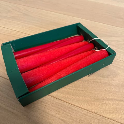 Rødt stearinlys i gavepose. Motivet forestiller jesusbarnet i krybben med Josef og Maria. Kan sendes eller hentes.
