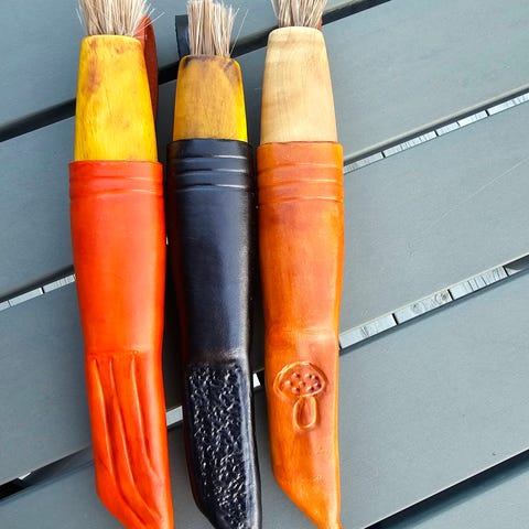 Noen striper på bladets venstre side, ellers i pen stand. Blad av rustfritt stål, lengde 8,8 cm. Brun lærslire.
