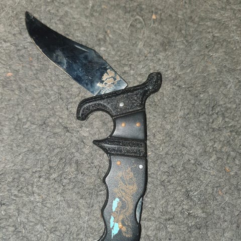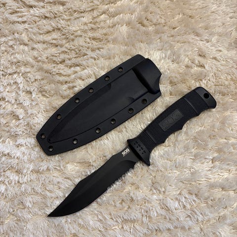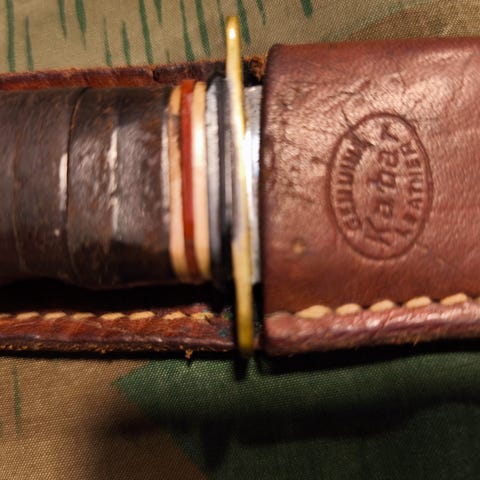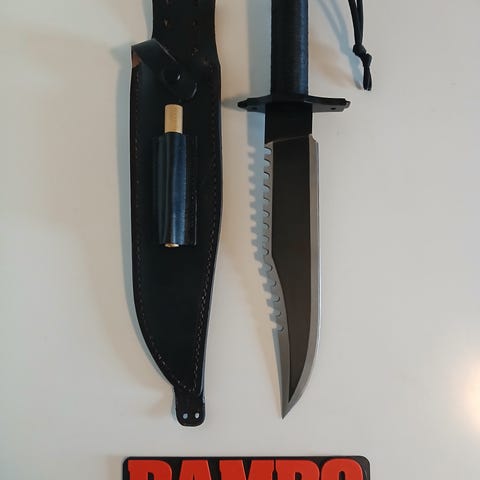 Kniv fra Fox Knives selges ubrukt (men uten emballasje) med slire og slipestein. Slipesteinen kan praktisk oppbevares i egen lomme på slira. Kniven er god og tung med et godt grep. Total lengde på kniv: 30cm.