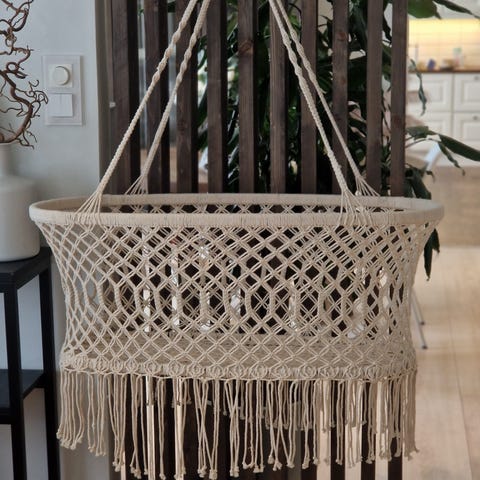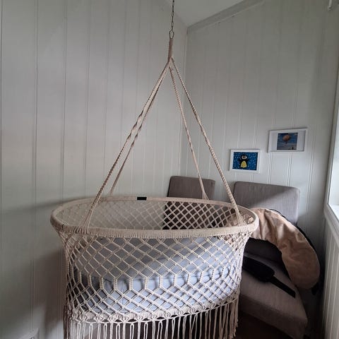 Selger en fin makramé hengevugge til baby, komplett sett. Veldig god hjelp for baby som liker å bli vugget.