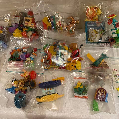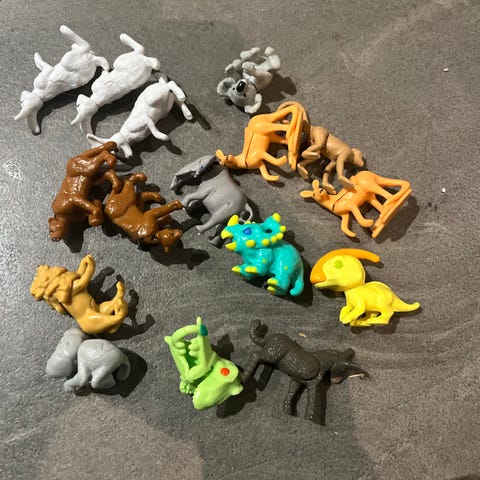 Samling av små figurer i plast i forskjellige farger og design. Figurene er pakket i flere plastposer og varierer i størrelse og utseende. Egnet for samling eller lek.