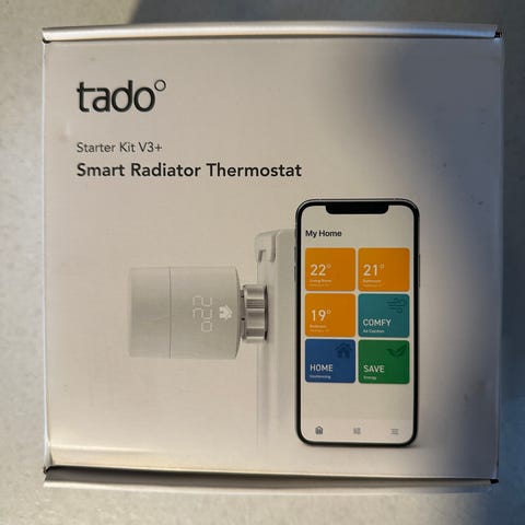 Tado Smart Radiator Thermostat smart termostat, kompatibel med smarttelefonstyring for regulering av radiatorvarme. Produktet inkluderer en termostat for individuell temperaturkontroll.
