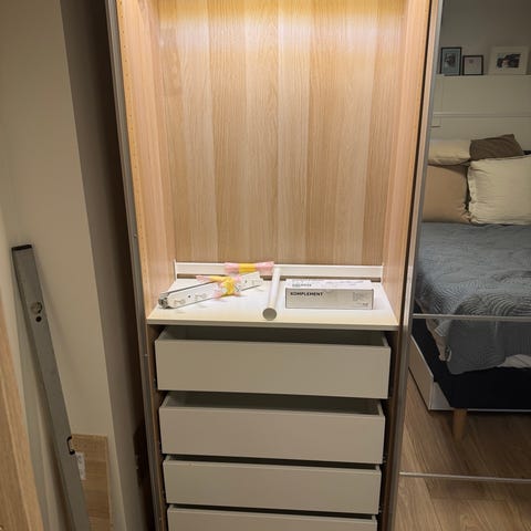 Skyline garderobe i eik med belysning. 75 x 58 x 236, komplett sett som visst på bilde inkludert stamme, belysning, innredning , skuffer , dører, hengsler og sideplate .Selges til 50% fra utstillingen .