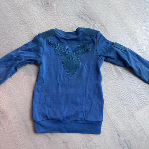 WoolLand ull genser i blå farge, størrelse 98-104. Genseren er laget av ull og har detaljer som brodert elgmotiv på brystet og et emblem på armen. Ingen synlige hull eller flekker.