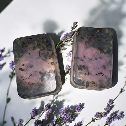 håndlaget såpe i lilla farge med chamomile & himmelert (butterfly pea) blomst. Såpene har lavendel essensielle dråper og lukter himmelsk. De er pakket i gjennomsiktig plast med en naturlig snor. Passer til daglig bruk for håndvask eller kroppsvask.