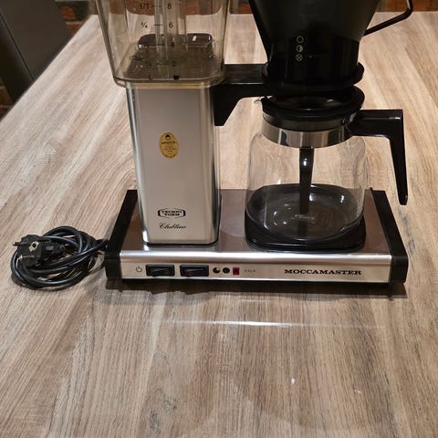 Technivorm Moccamaster Kaffeautomat med kapasitet på 1 liter. Kaffen brygges med et hvitt kabinett og glasskanne. Modellen har en enkel bryggemekanisme og er produsert i Nederland. Strømforsyning: 220-240 V, 50-60 Hz, 1100-1400 W.