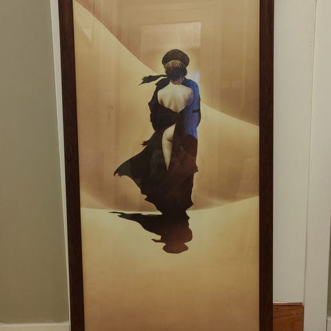 Trykket er innrammet med bred passepartout og aluminiumsramme i sølvfarge. Signaturen er plassert nederst til høyre i motivet. Verket fremstår i meget god stand, uten synlige skader eller falming. Rammen er hel og pen, med normal bruksslitasje på baksiden.