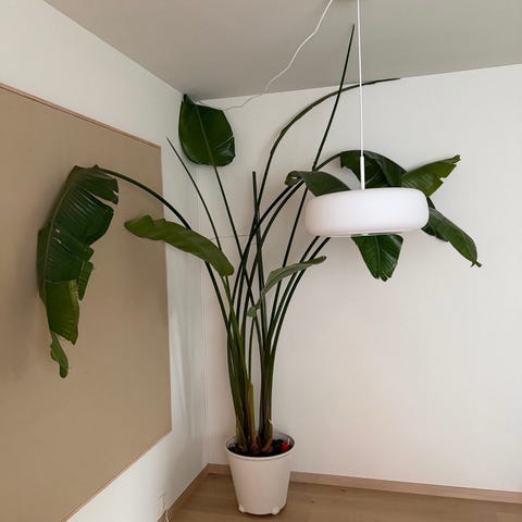 Strelitzia nicolai er en stor potteplante med brede grønne blader. Planten har flere høye stilker og er plassert i en stor grønn potte av høy kvalitet. Selges samlet.