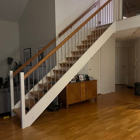 Mangler 1 stk håndløper på øverste trapp som ble kastet ved feiltakelse.