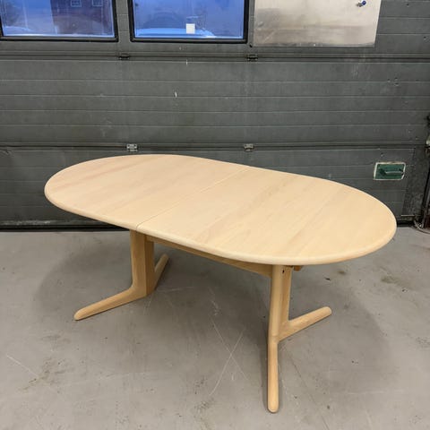 Fantastisk flott spisebord i heltre bøk med 2 plater, også i heltre (sjeldent) Bordet er pusset ned og oljebehandlet for en matt finish. Fremkommer som strøkent. Flotte og enkle linjer. Klassisk dansk design.