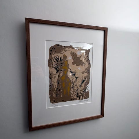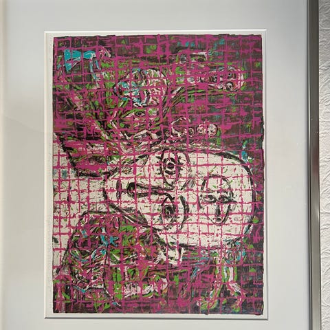 Innrammet maleri med abstrakt motiv og flere figurer. Bildet har en rosa og rød fargepalett med svarte detaljer. Passer som dekorasjon i hjem eller kontor.