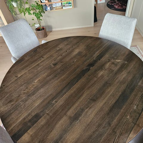 Kristiansen & Kristiansen Elements rundt spisebord Ø120 H74 cm plate BRM 4cm buet kant, oljet heltre ask gråbrun med sorte ben. Kjøpt hos Bohus, brukt kun 6 mnd , selges pga plass. Liten kosmetisk flekk ( bilde 4) pga mikrofiberklut, olje medfølges. Må hentes pga vekt.