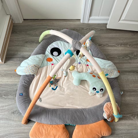 Done by Deer aktivitetsmatte for barn med mykt materiale og flere hengende leker. Designet for å stimulere barnets sanser og motoriske ferdigheter.