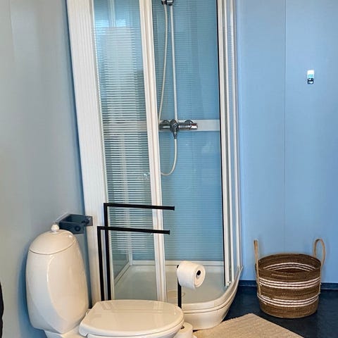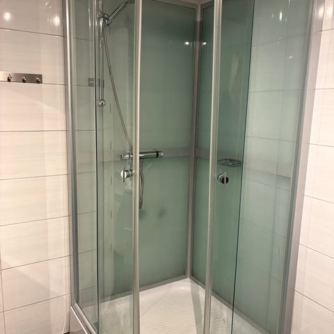 Dusjkabinett med svingbare glassdører i ramme av metall. Passer for hjørneinstallasjon. Glassdørene gir enkel tilgang til dusjområdet. Kompakt størrelse egnet for mindre baderom.