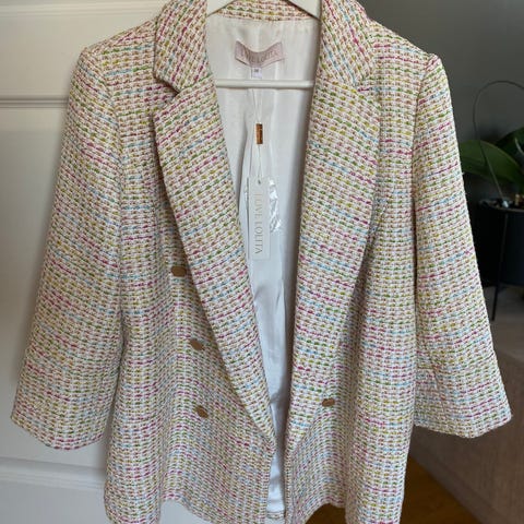 Nydelig boucle - blazer fra Love Lolita. På avstand ser den rosa ut, men på nært holdt ser man at den er laget i en nydelig mønster av rosa, lilla, gull og beige., se bilder. Et nydelig plagg, men får dessverre ikke brukt den slik den fortjener. Kun brukt et par ganger.