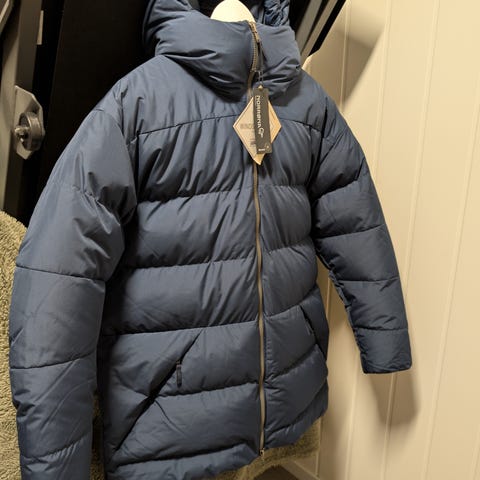 Jakken ble opprinnelig kjøpt som gave, men da passformen ikke var helt riktig, har den blitt liggende i skapet. Den er så vidt brukt og fremstår som ny, med unntak av et lite merke på ermet som er tydelig vist på bilde 3. Dette er den oppdaterte versjonen av Paclite-serien (modell 1814-22) i en frisk turkis og blå fargekombinasjon.