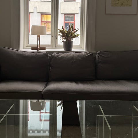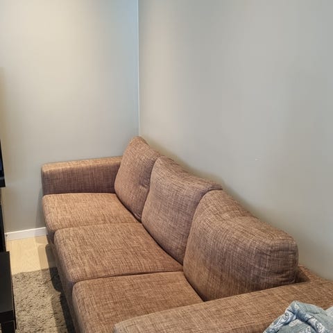 Sofaen er i god stand, men den er misfarget. Den har gule skjolder spesielt i fronten av ryggen og på armlenene. Den ble sånn da den ikke tålte tekstilrens en jeg brukte.