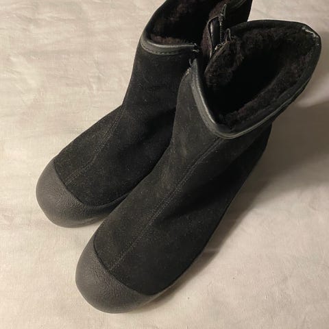 Skoene har lite til ingen slitasje på utsiden og i skaftet av skoen. Fôret har blitt tråkket litt ned i sålen inne skoen. Den ene skoen trenger også ny glidelås, men dette kan trolig gjøres for noen få hundrelapper hos skomaker.