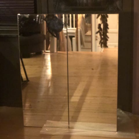 Sett bestående av baderomsskap uten vask og tilhørende skap i grå farge. Skapene har mønstrede dører og svarte håndtak. Passer for oppbevaring på badet, med integrert vask for enkel bruk. Skaper noen 40 cm, 30 cm.
