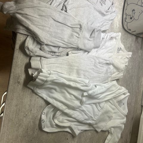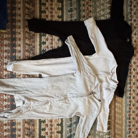 Three & Spencer vaffelstil-jumpsuits. Materialet er bomull. Disse er en UK 9-12, altså omtrent tilsvarende en EU 74. Disse er veldig søte, og min favorittstil — jeg har kjøpt noen i alle størrelser.