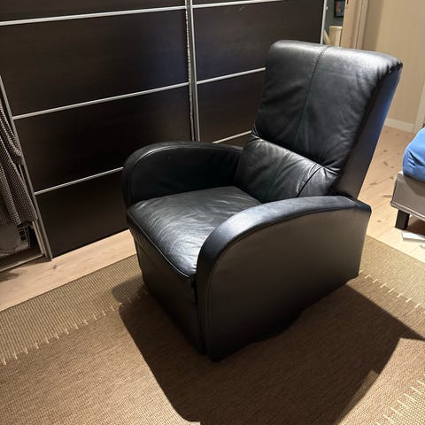 Lenestol i brunt skinn. Med fot hviler som kan tas ut. Hel og grei! Mye stol for pengene. Må hentes! Pris kan diskuteres.