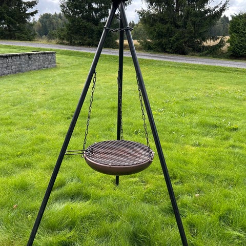 Fire Pit FCCBBQ (Flying Culinary Circus) Square bålpanne med grillrist og vedlager. Bålpannen kombinerer kull- og vedfyring, med en grillrist på 43 x 34 cm og et vedlager under. Egnet for utendørs bruk, designet for matlaging og bål.