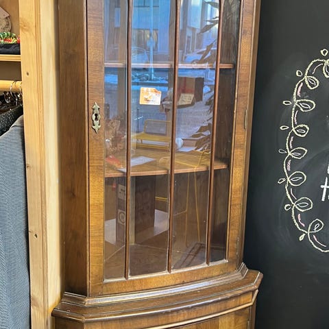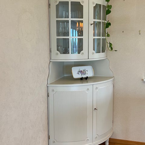Nydeleg hjørneskap og vitrineskap i Gustaviansk stil vurderast solgt, då dei mest står til pynt her. Må hentast i Årdalen/Kjølsdalen. Begge skåpene kan demonterast til to delar, for enklare frakt. Selgast helst samla.