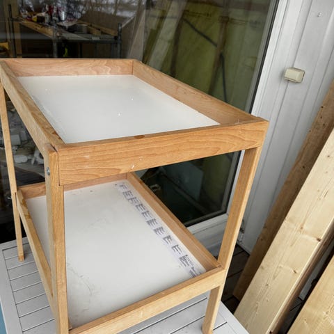 Stellematte med trebasen. Rev litt i et hjørne, men det går fint med lakenet.