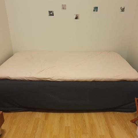 Overmadrassen har en del flekker og bør byttes ut eller renses. Men resten av senga er fin. En veldig god seng med mye bruk igjen.