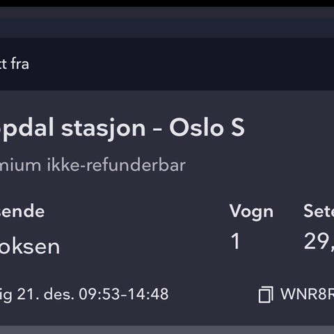 Kjøpte billett til feil dato. Avgang kl 1415 fra Sandvika, kl 1434 fra Oslo S. Billett med studentrabatt, kostet kr 269, selges for kr 135.
