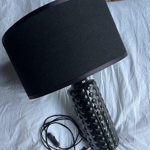 Bordlampe med mørkebrunn fot og hvit stofflampeskjerm. Lampen har en høyde på cirka 41 cm. Passer til bruk som leselampe eller stemningsbelysning i ulike rom.