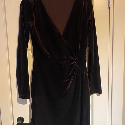 Veldig fin, mørk brun kjole fra Claire. Lappen er dessverre klippet bort, men tror den eri str S, evt en litt liten M. I veldig god stand og behagelig å ha på