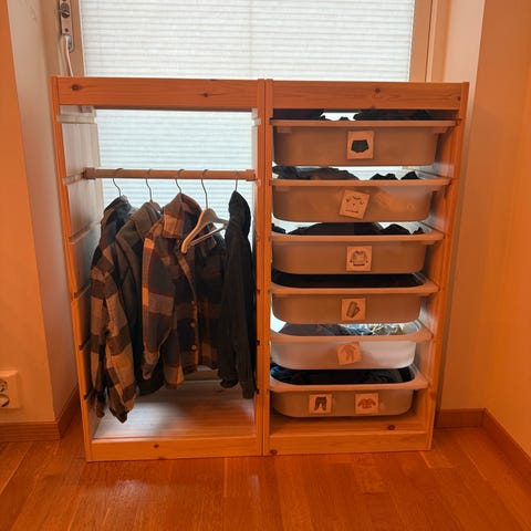 Hvit stamme med oppbevaringsbokser i ulike farger.