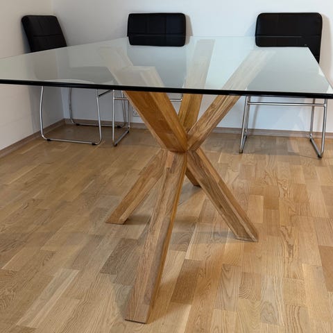 Abbetved skrivebord fra Jysk med eikefarget bordplate og svart ben i stål. Har to åpne rom for oppbevaring og en skuff. Pent brukt med kun noen få riper i skuffen. Ny pris var 1399 nok.