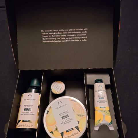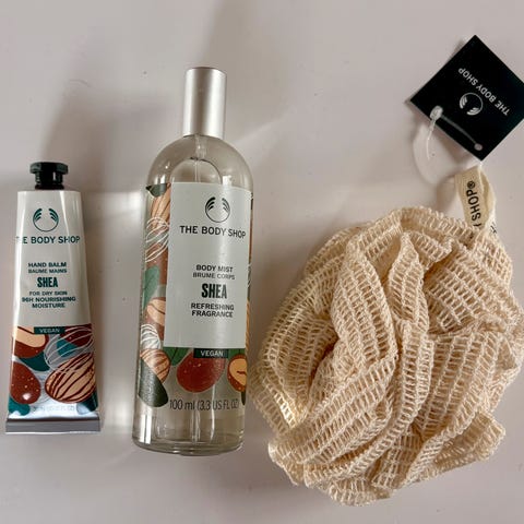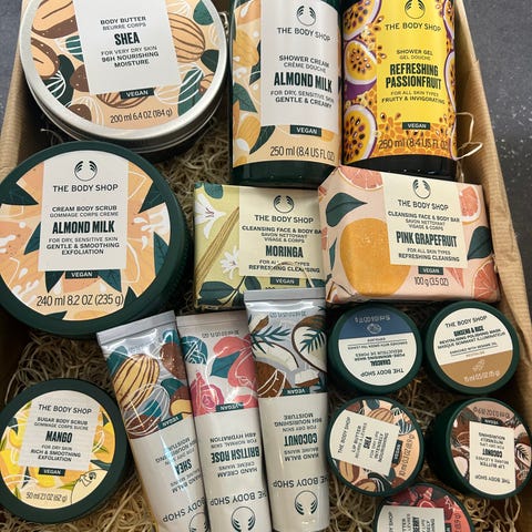 The Body Shop assorterte hudpleieprodukter inkludert kroppssmør, håndkrem, såpe og ansiktspleie i ulike dufter og ingredienser som mandelmelk og pasjonsfrukt. Produktene kommer i forskjellige størrelser og emballasjer, egnet for daglig hudpleie. Verdi kr. 1582,-
