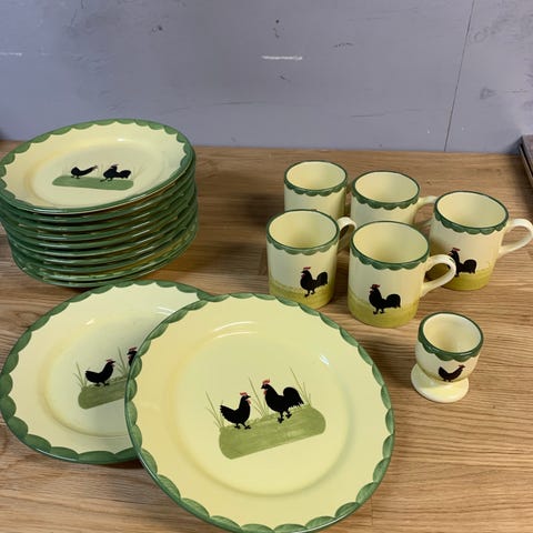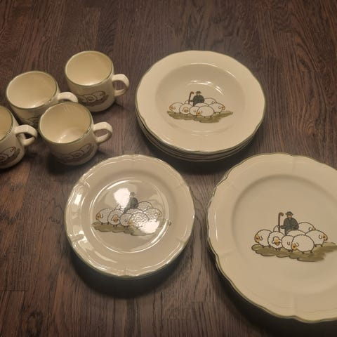 6 stk selges samlet. 2 av tallerkenene har noe merke , se bilder. 25 cm i diameter. Uten skår , hele og pene.