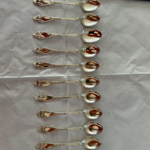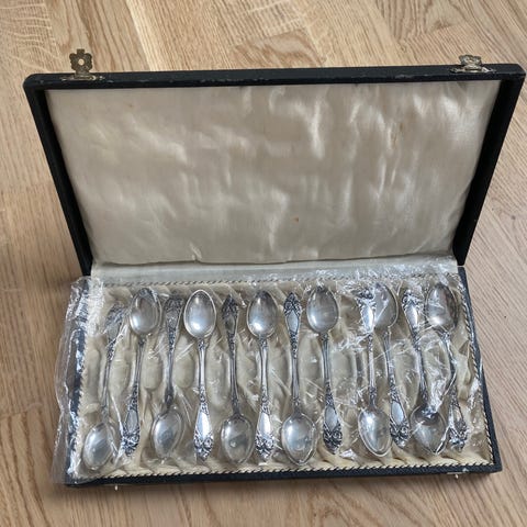 Sett med 12 skjeer i sølv i mønsteret ophøiet rose / opphøyd rose designet av Robert Geiger. Ikke synlig brukt. Skjeene har en lengde på 11,8 cm hver.