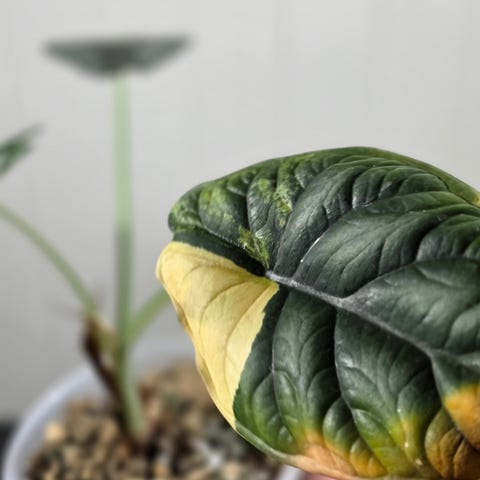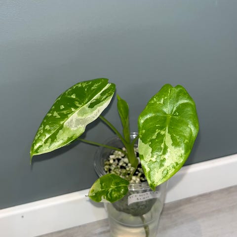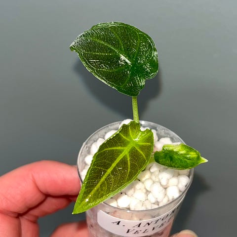 Alocasia Regal Shield stor plante. Planten har en tykk, kraftig stamme og kommer i stor potte. Det vokser et par andre planter i potten også. Planten trenger en god vask men er ellers kraftig. Hentes i Haugesund.