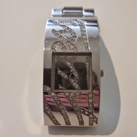 GUESS dame klokke. Kjøpt for over 10 år siden. Synlig brukt og noe slitasje men enda bruk igjen. Klokken er ikke stilt/byttet batteri. Følger med et ekstra ledd for å gjøre den større.