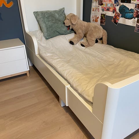Sengen er skrudd fra hverandre så den får plass i en bil.