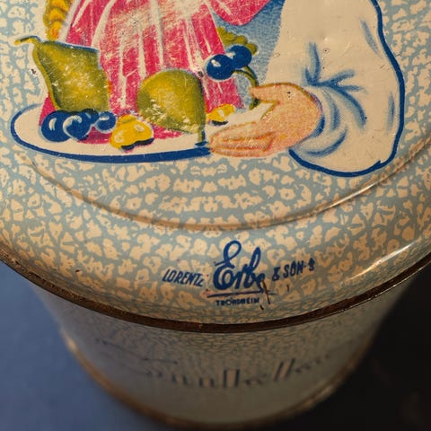 Pen kakeboks med logo med jente og tekst. De tusen hjems dessert. ERBE & son a/s. Diameter 22 cm. høyde 13 cm. Noen små brukerspor. Selges 160,- Sender post.