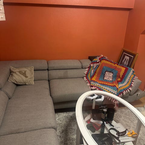 Hjørnesofa m sjeselong selges. Mål står på det ene bildet. 750kr - kan diskutere pris ved hurtig avgjørelse.
