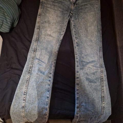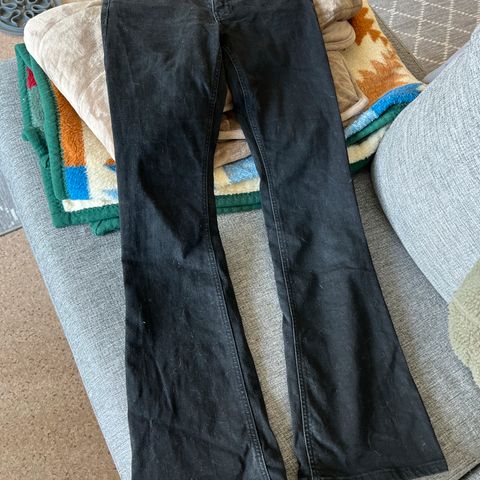 Gina Tricot Low Waist Petite Bootcut bukser i svart denim, størrelse 32. Lav midje og bootcut passform.